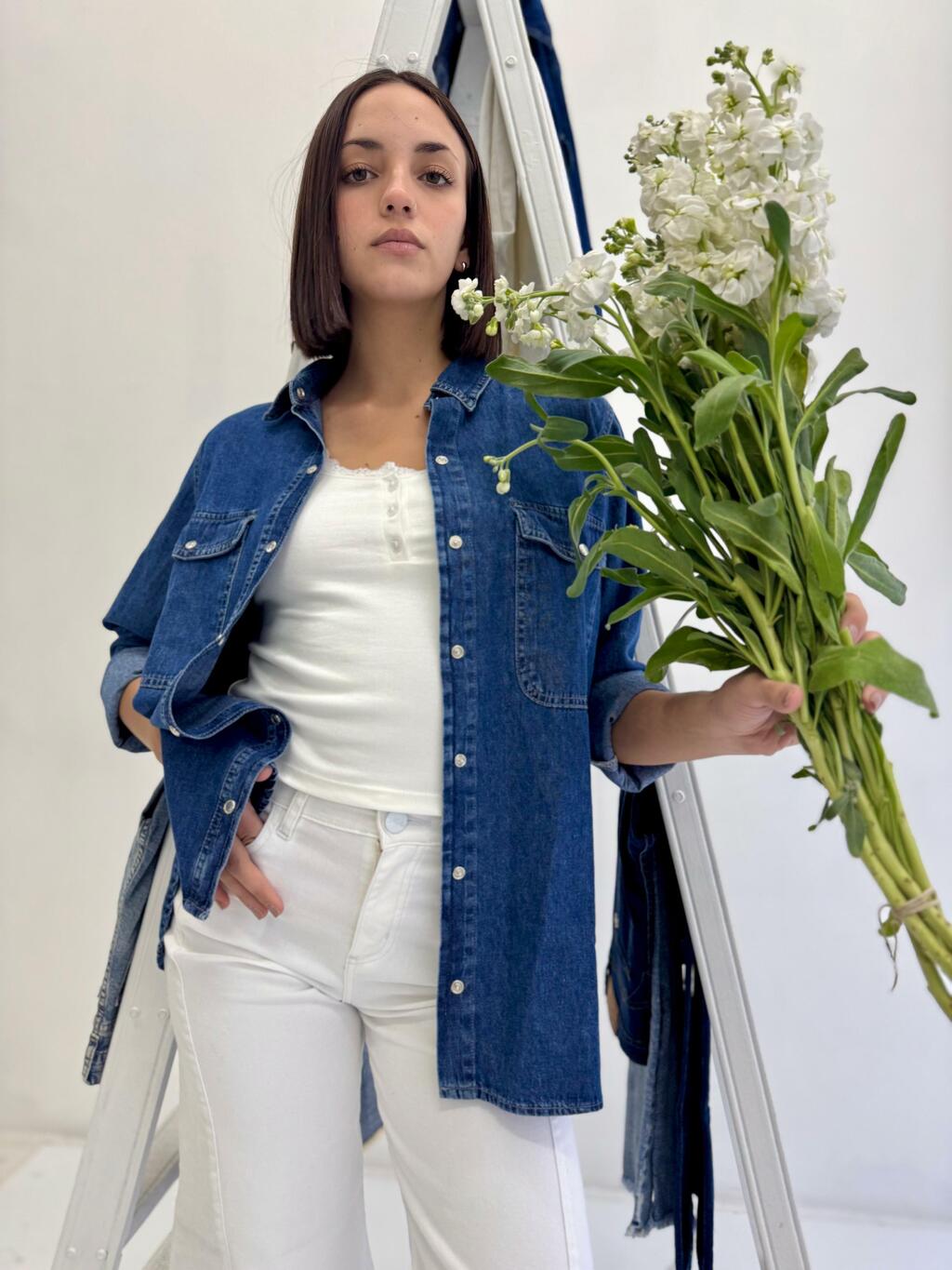 La clásica que nunca falla. Nuestra camisa de jean Del Pilar en azul oscuro es ese infaltable que vas a querer usar todo el año. Con cuello solapa, bolsillos delanteros, manga larga, cierre frontal con botones con brillitos que le dan un toque chic y femenino y un calce relajado que queda divino.