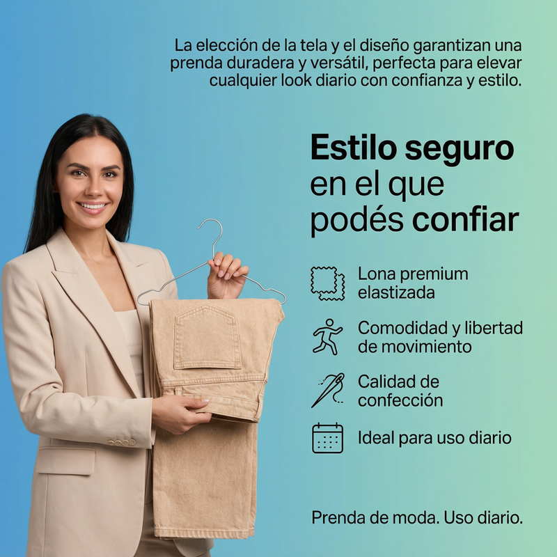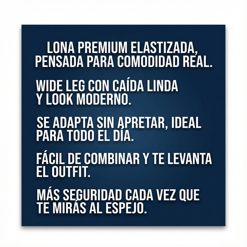 Su lona premium elastizada está pensada para acompañarte con libertad de movimiento y una caída hermosa, ideal para el día a día, salidas, fotos y cualquier momento donde querés verte bien sin esfuerzo.
