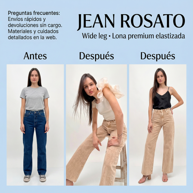 Con JEAN ROSATO, tu jean wide leg de lona premium elastizada, tu look se ve más estilizado, con mejor caída y comodidad real, mientras disfrutás de una textura firme pero flexible y súper cómoda para todo el día.