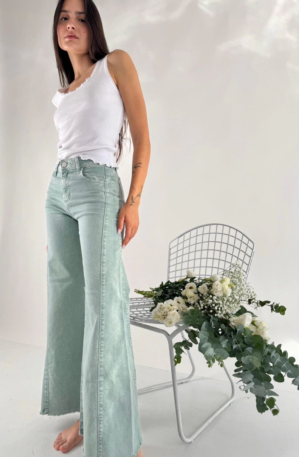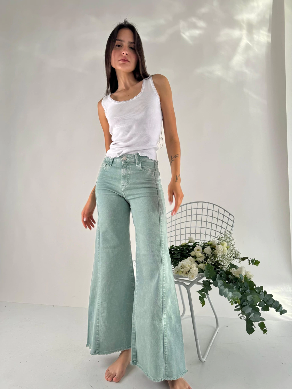 Descubrí el Jean Jade, una prenda imprescindible con estilo wide leg en un delicado tono verde agua. Confeccionado en lona premium elastizada, ofrece un calce perfecto que se adapta a tu cuerpo, garantizando máxima comodidad y libertad de movimiento.