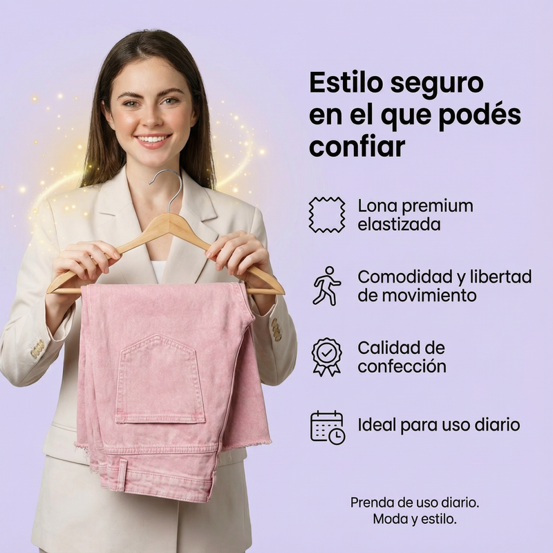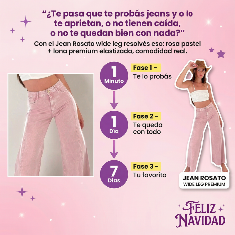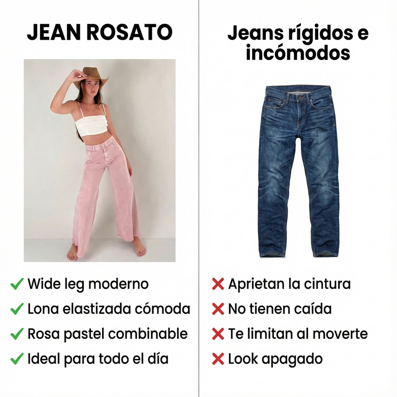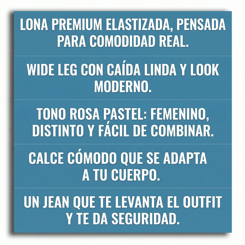 Con el Jean Rosato wide leg resolvés eso en una sola prenda: tono rosa pastel que levanta cualquier outfit + lona premium elastizada que se adapta al cuerpo con comodidad real.